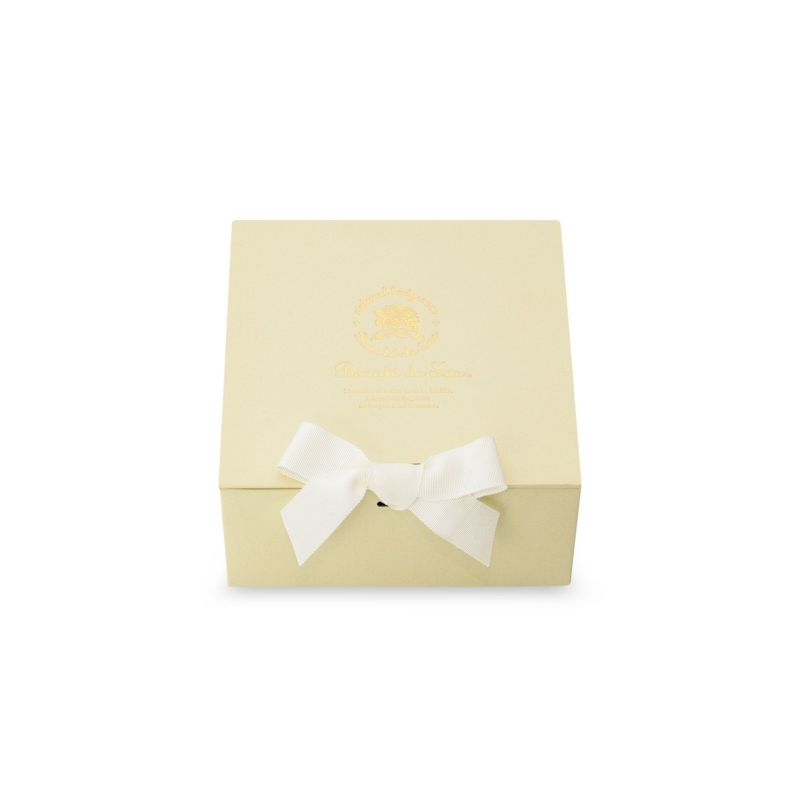 箔押しが施された上品なボックスに、幅広なリボンで封をする華やかな印象のギフトボックス。どのアイテムにもマッチする淡いイエロー系のベージュ。