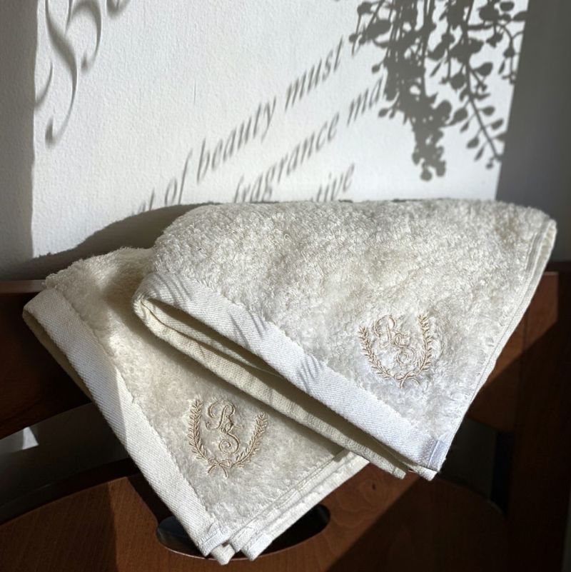 同系色のロゴ刺繍がさり気なく施された、ボーテ デュ サエ オリジナルのハンドタオル。上品な仕上がりのハンドタオルは、プラス一品の贈り物としてもおすすめのアイテムです。
