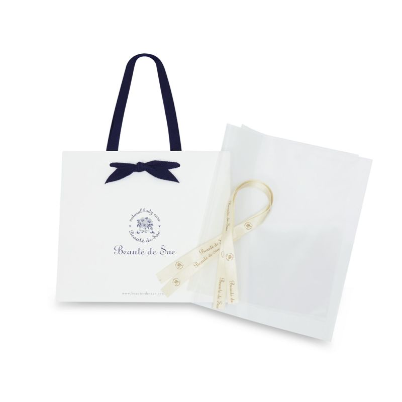 ワンポイントのロゴが入った上質な紙袋と、上品なロゴ入りのリボン、透明のラッピング袋2種類がセットになったラッピングキット。