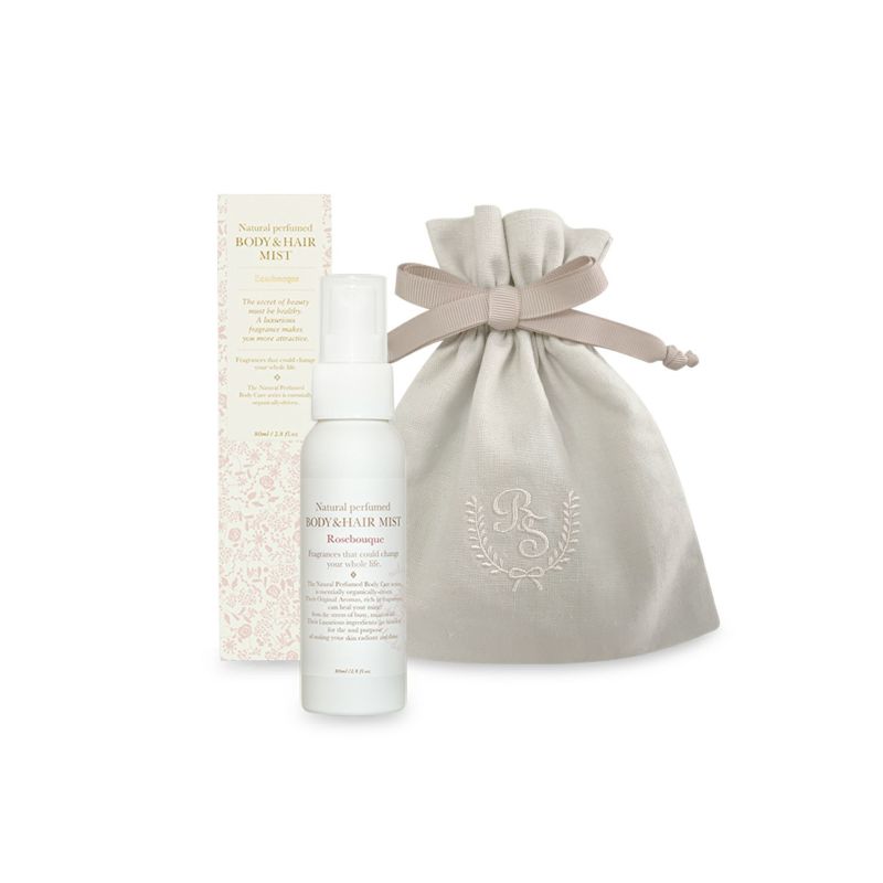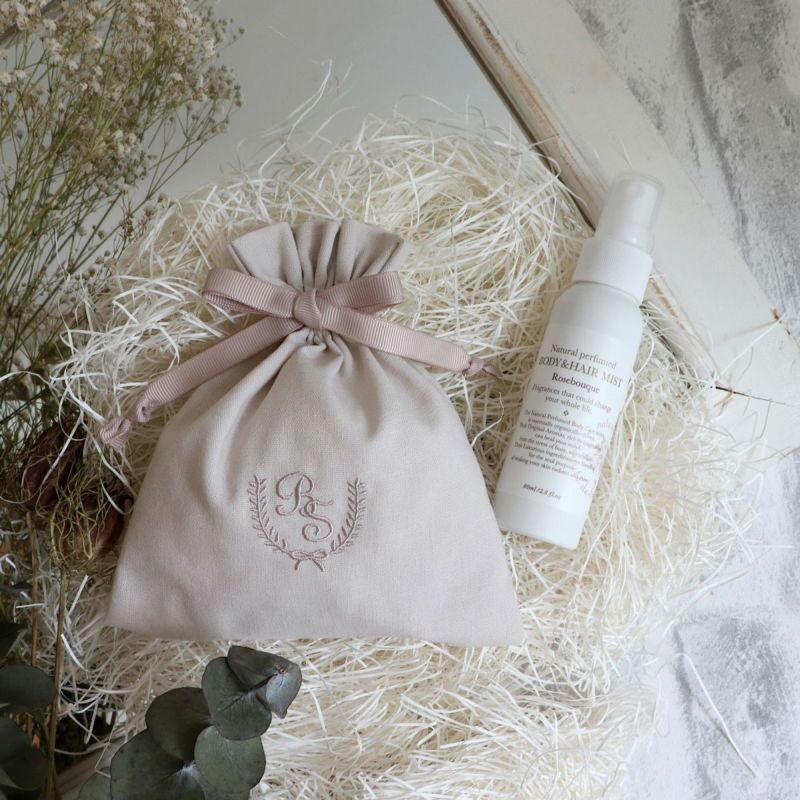 プチギフトにおすすめ|ギフトセット【R】 トワレより軽く瑞々しい使用感の「フレグランスミスト」と、ロゴ刺繍が施された可愛らしいサイズの「巾着ポーチ」のセットをラッピングしてご用意。