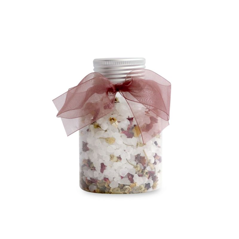 海塩にドライハーブをブレンドした色鮮やかなバスソルト。ゴージャスなローズの花びらと可憐なカモミールジャーマンのハーブが、バスタイムを華やかに彩ります。